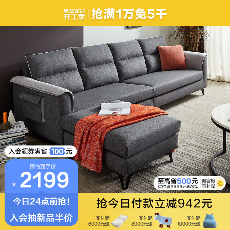 全友家居简约四人位直排沙发布艺沙发凳北欧一字沙发客厅小户型102567价格:3141.43元!