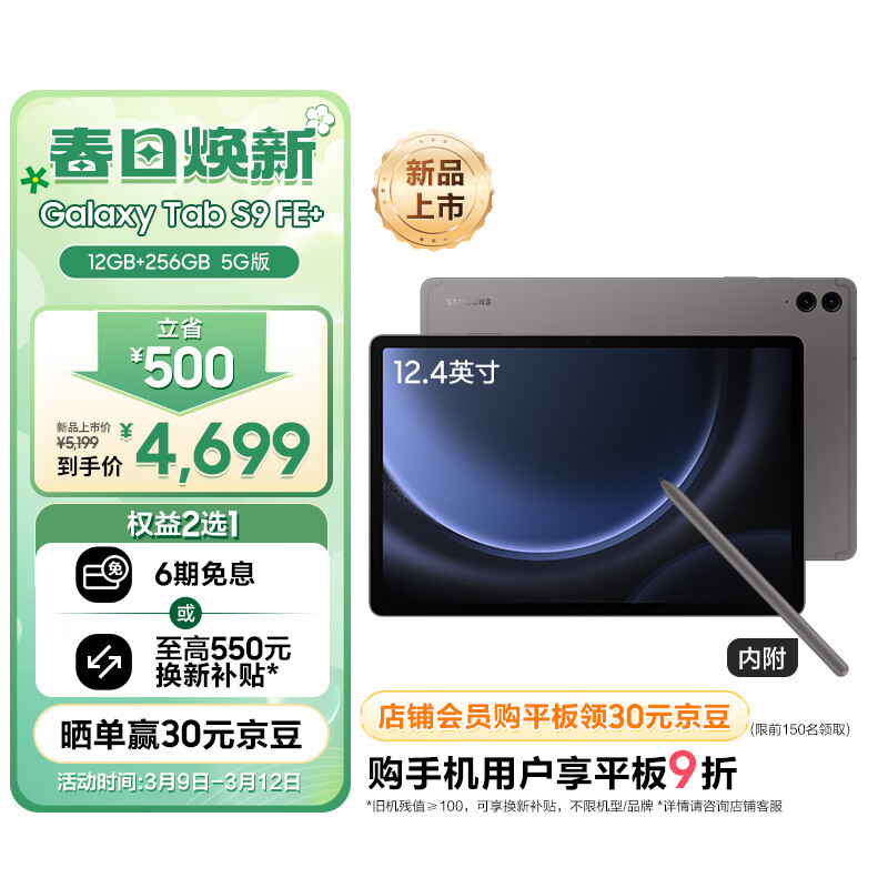 三星(SAMSUNG) S9 FE+ 2023款Tab平板电脑12.4英寸12+256GB 5G版护眼高清大屏IP68防水含Spen 石墨灰价格:4699.00元!