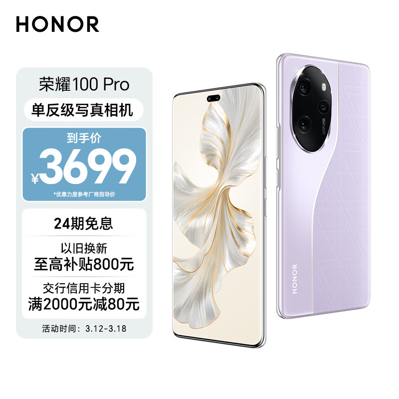 荣耀100 Pro 单反级主摄 荣耀绿洲护眼屏 第二代骁龙8旗舰芯片 立体声双扬声器 OIS 16+256 莫奈紫 5G价格:3699.00元!