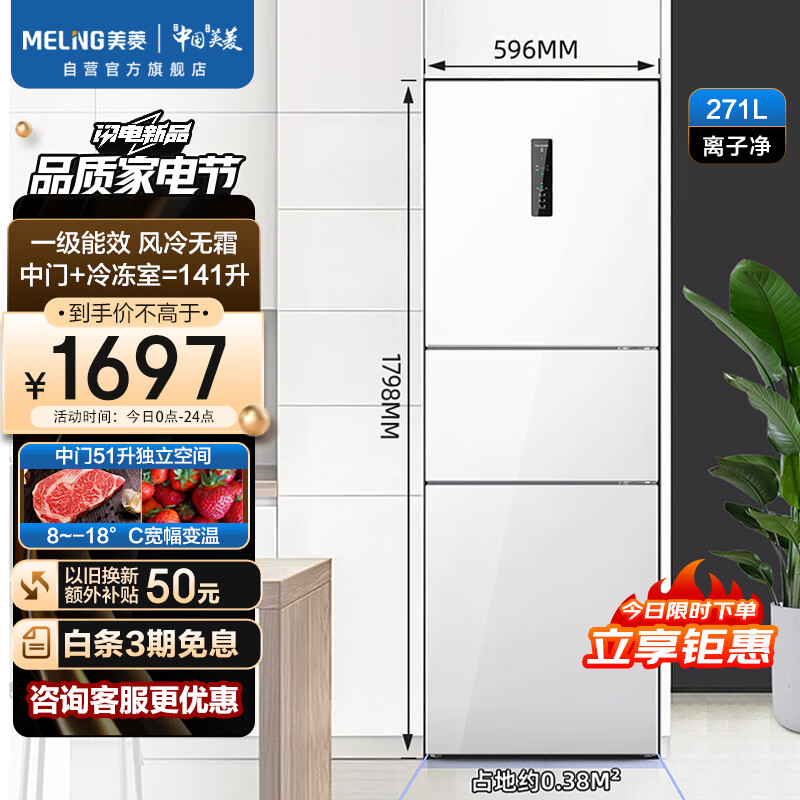 美菱(MeiLing)【离子净】271升三门家用冰箱变频一级风冷无霜低噪租房宿舍白色小型冰箱BCD-271WP3CX以旧换新价格:1697.00元!