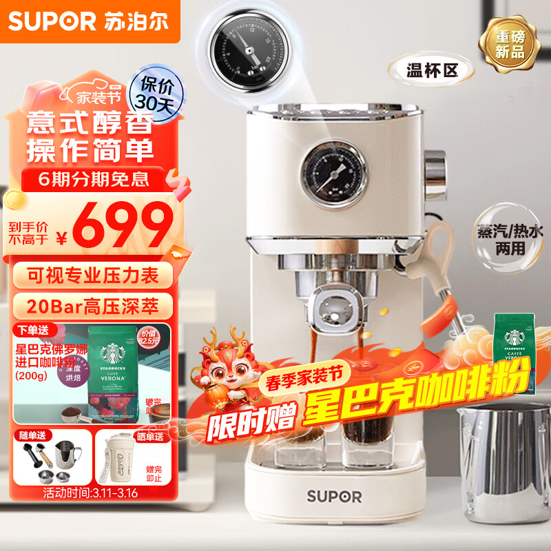 苏泊尔(SUPOR)意式家用浓缩半自动咖啡机 礼物送长辈 办公室小型便携摩卡手冲壶 全自动现磨美式奶泡 SW-CFB501价格:699.00元!