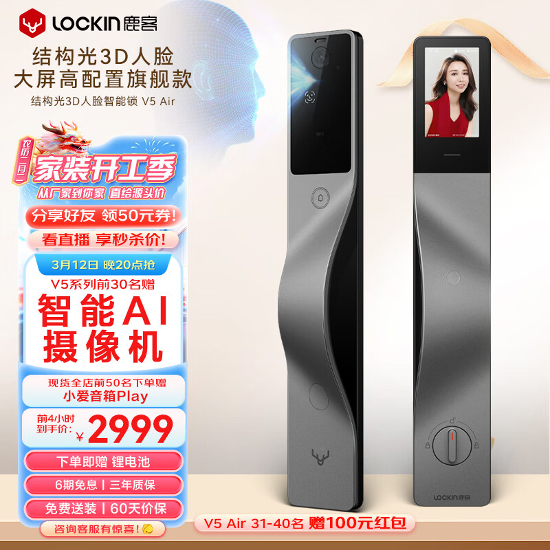 鹿客(lockin)V5 Air结构光人脸识别猫眼大屏智能密码锁APP智联适用右开门价格:3699.00元!
