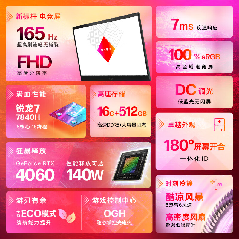 惠普(HP)暗影精灵9 16.1英寸游戏本 笔记本电脑(R7-7840H RTX4060 16G 512GB 165Hz)价格:7499.00元!