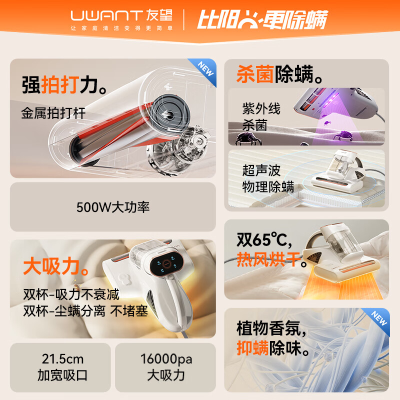 uwant友望除螨仪双杯尘螨分离家用床上紫外线杀菌除螨机超声波去螨虫大吸力吸尘神器M300SE太阳光价格:539.00元!