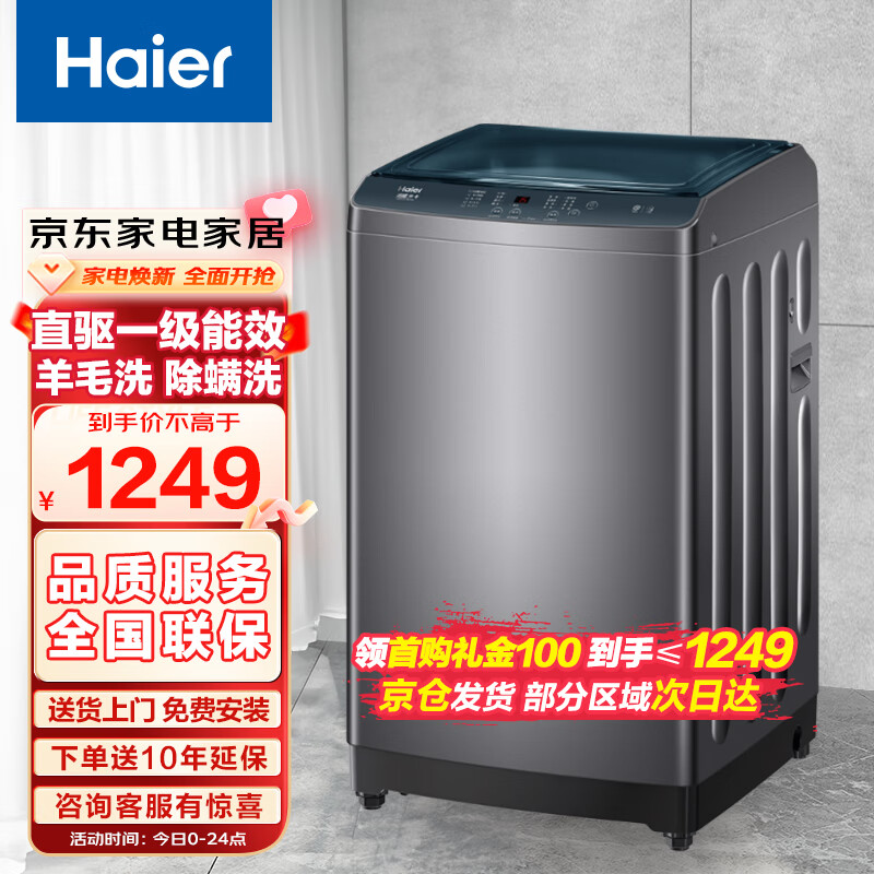 海尔(Haier)【23年上新】10KG波轮洗衣机全自动家用大容量直驱变频一级能效预约除螨羊毛洗XQB100-BZ506[家电]价格:1349.00元!