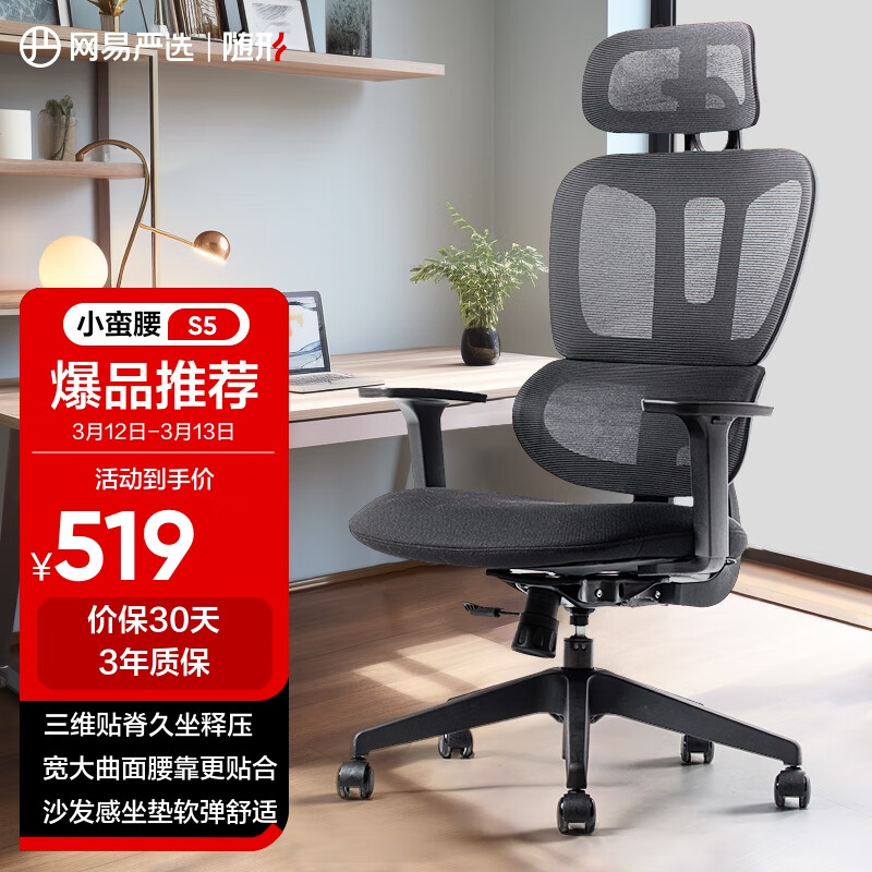 网易严选小蛮腰S5无搁脚 人体工学电脑椅办公电竞老板椅会议学习座椅凳子价格:519.00元!