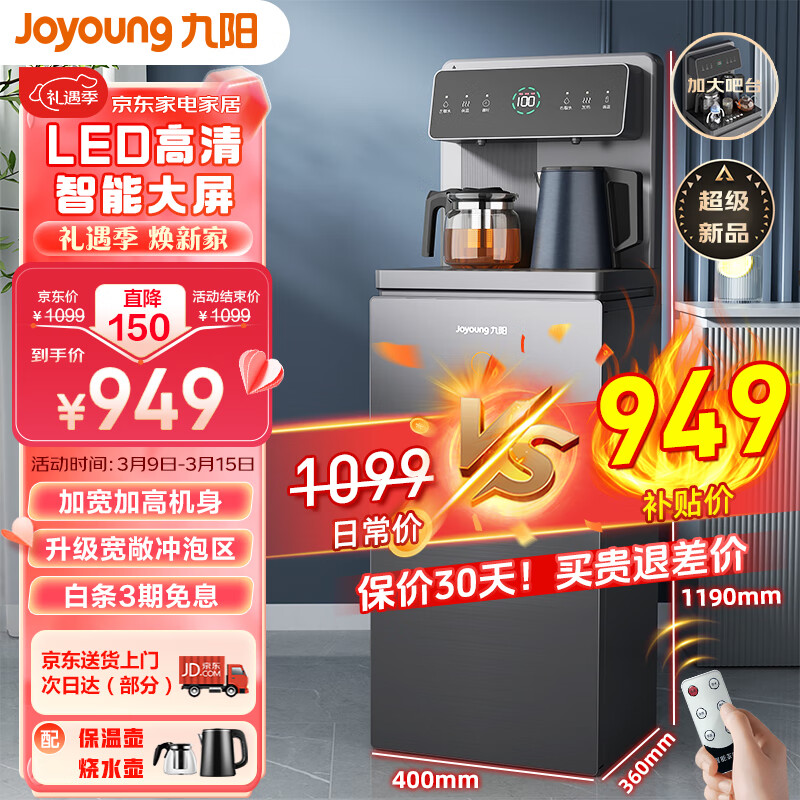 九阳(Joyoung)家用茶吧机智能遥控大屏下置水桶饮水机 双温双显双出水口 立式智能茶吧机 冰温热款 【远航灰】价格:949.00元!
