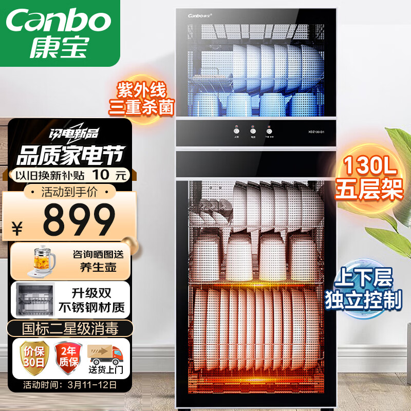 康宝(Canbo)消毒柜家用立式不锈钢大容量商用面馆小型130L家庭餐具紫外线双门二碗筷消毒碗柜XDZ130-D1价格:899.00元!