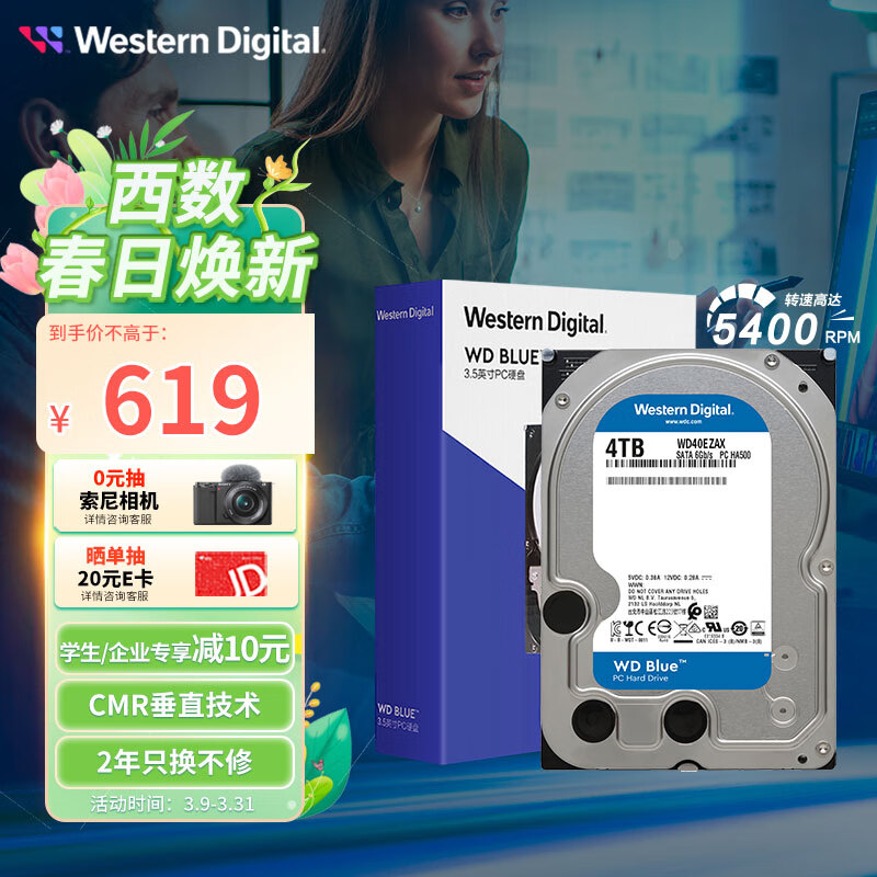 西部数据 台式机机械硬盘 WD Blue 西数蓝盘 4TB 5400转 256MB SATA CMR (WD40EZAX)价格:599.00元!