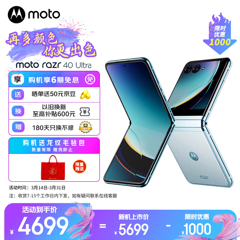 摩托罗拉 moto razr 40 Ultra 掌心巨幕 外屏海量应用 骁龙8+ 5G折叠屏旗舰手机 8GB+256GB 冰晶蓝价格:4999.00元!