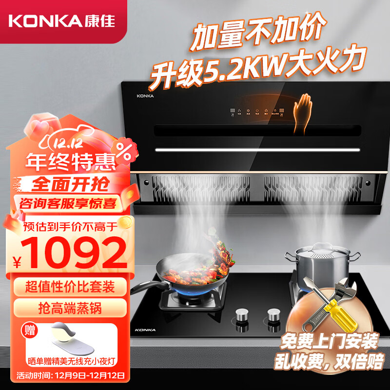 康佳(KONKA)侧吸式抽油烟机燃气灶具套装 顶侧双吸家用20m3/min大吸力烟灶两件套装 KJ38+B500F(液化气)价格:1092.00元!