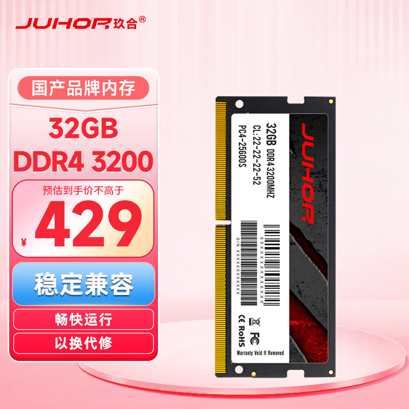 JUHOR玖合 32GB DDR4 3200 笔记本内存条价格:429.00元!