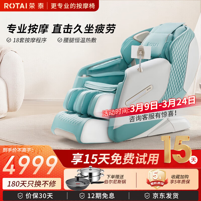 荣泰(RONGTAI) 按摩椅家用全身太空舱零重力多功能智能电动按摩沙发椅子生日礼物 A50 苹果绿价格:10999.00元!