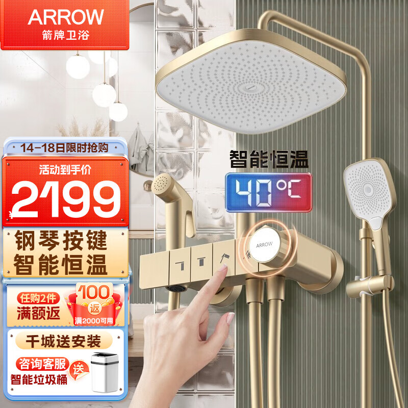 箭牌(ARROW) 淋浴花洒套装增压花洒全套莲蓬头淋雨器套装浴室花洒按键花洒 【拉丝金】按键丨恒温款价格:2599.00元!