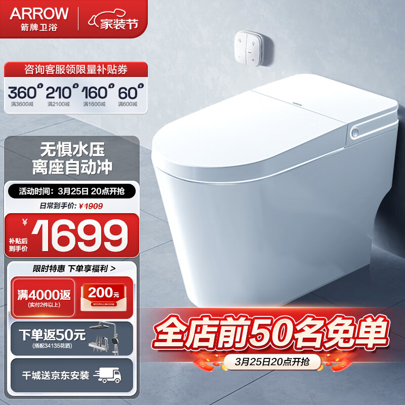箭牌(ARROW)轻智能马桶一体机低水压自动冲水 小户型家用智能坐便器AKE1176L价格:2889.00元!