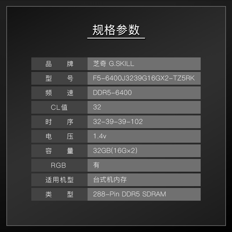 商品名称:G.SKILLF5-6400J3239G16GX2-TZ5RK