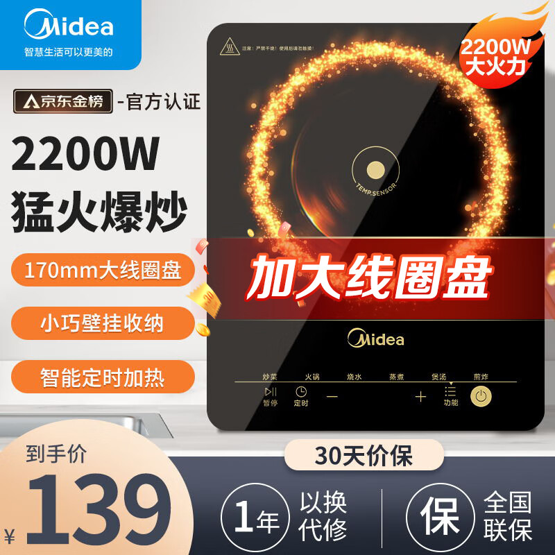 美的(Midea) 电磁炉大功率家用 防水面板2200W大功率 炒菜火锅不粘炒锅一体小型电磁灶 【高性价比裸机款】MC-E22B12 电磁炉价格:138.90元!