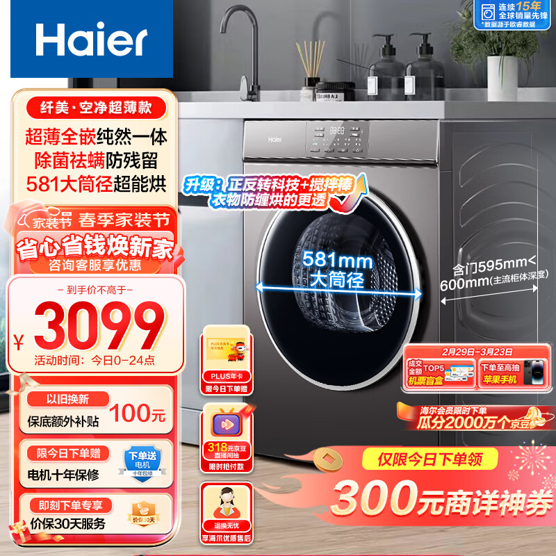 海尔(Haier)超薄全嵌烘干机家用 10公斤热泵干衣机 防缠绕 速烘节能 除菌除潮除螨 EHG100MATE36S 以旧换新价格:3399.00元!