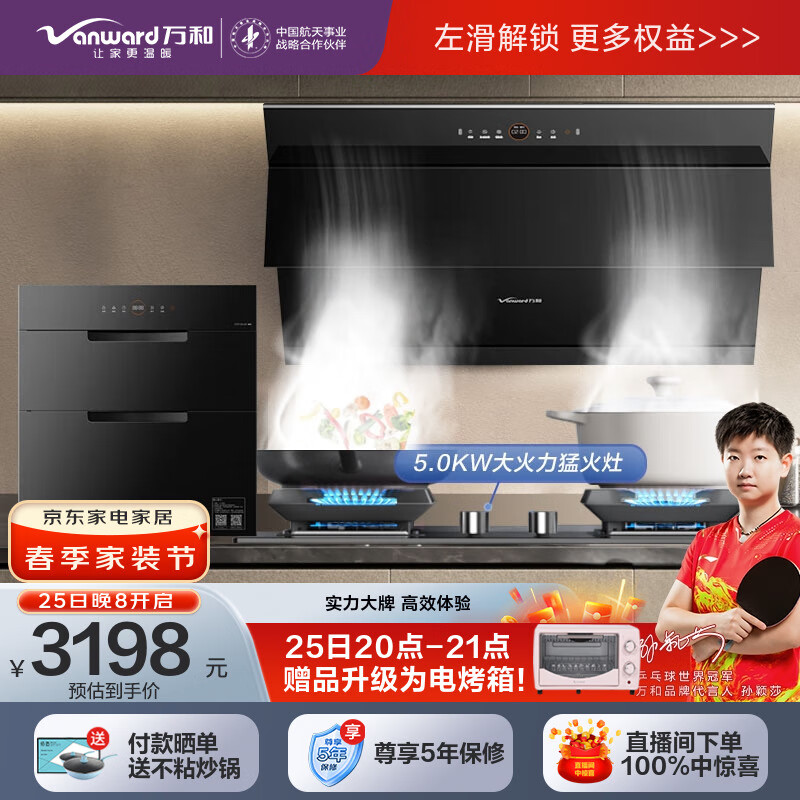 万和(Vanward)烟灶消三件套 24风量直流变频抽油烟机燃气灶具消毒柜套装WJ920+C5L90S+ZTD110Q-D8(天然气)价格:3198.00元!