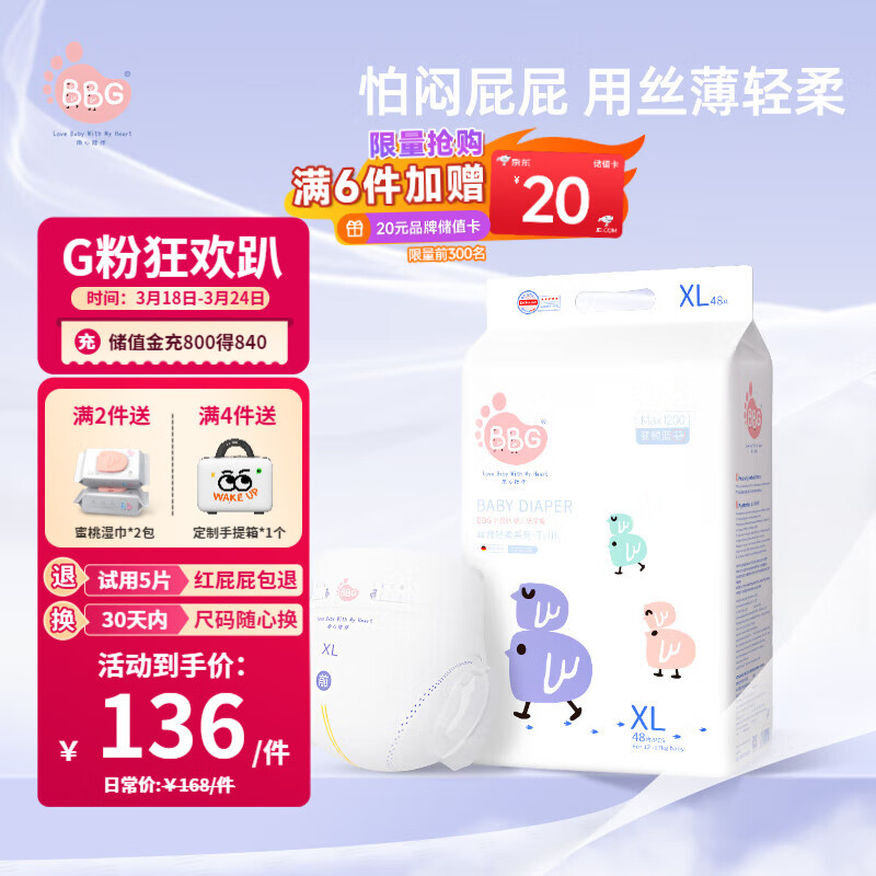 BBG蓝芯丝薄轻柔bbg纸尿裤XL码48片(11-14kg)尿不湿超薄透气瞬吸秒干价格:155.00元!