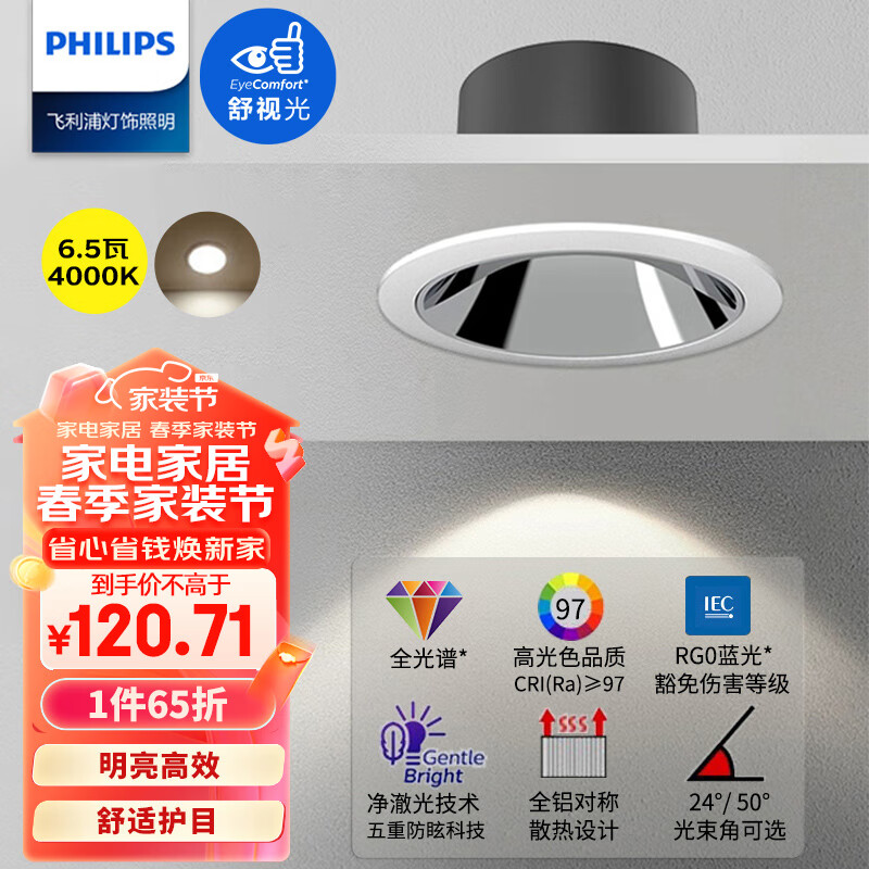飞利浦全光谱防眩筒灯嵌入式客厅护眼孔灯全铝灯具6.5W4000K孔75-77mm价格:185.71元!