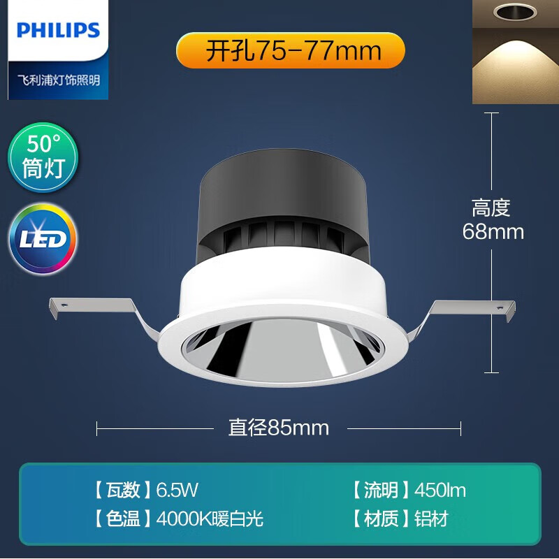 飞利浦全光谱防眩筒灯6.5W4000K孔75-77mm配置参数: