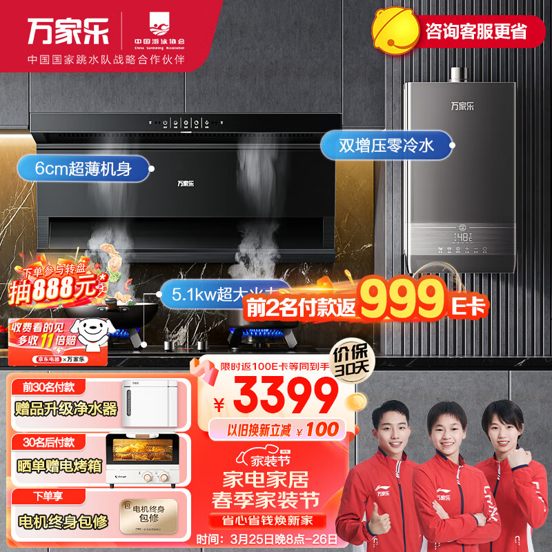 万家乐顶侧双吸油烟机 23立方厨卫烟灶热三件套装 16L双增压零冷水热水器套装TAK5+TAC5+16DL1天然气价格:3599.00元!