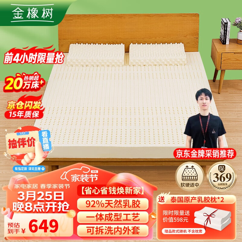 金橡树泰国乳胶原液进口床垫榻榻米双人床垫 1.5米*2米 泰舒 含内外套价格:749.00元!