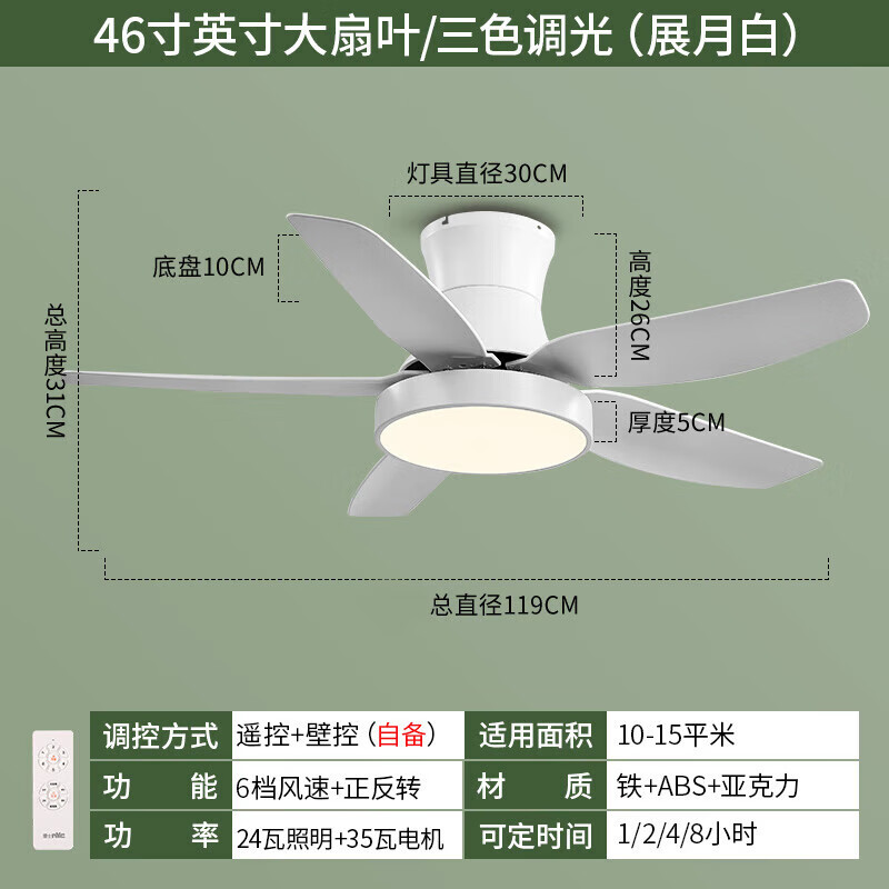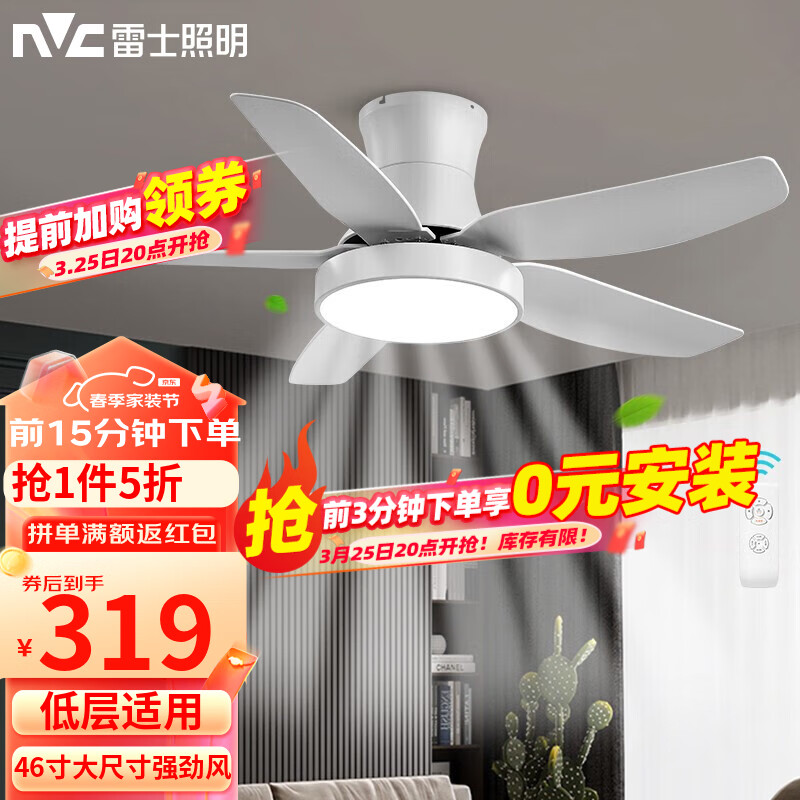 雷士(NVC)风扇灯开叶吊扇灯北欧现代客厅餐厅变频电机遥控三色光46寸大尺寸价格:738.00元!