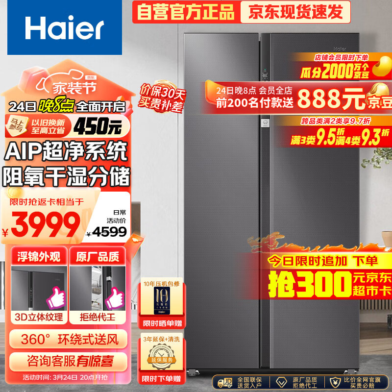 海尔(Haier)630升风冷无霜对开门双开门电冰箱家用一级能效变频节能智能除菌净味超大容量BCD-630WGHSS95SMU1价格:4299.00元!
