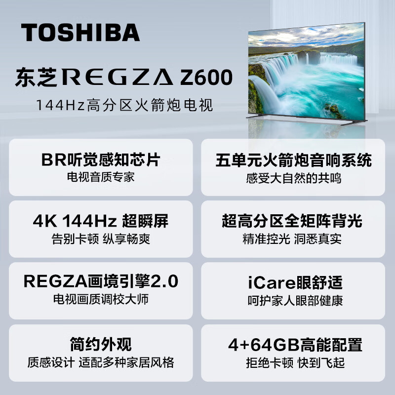 东芝电视65Z600MF 65英寸144Hz高分区【包安装版】 BR听觉感知芯片 火箭炮智能游戏电视机价格:5138.00元!