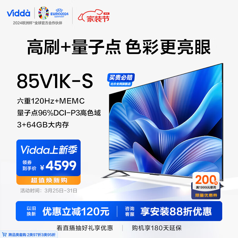 Vidda 海信电视 85V1K-S 85英寸 120Hz高刷 3+64G 游戏电视 4K超高清 超薄屏 智能巨幕电视以旧换新价格:4799.00元!