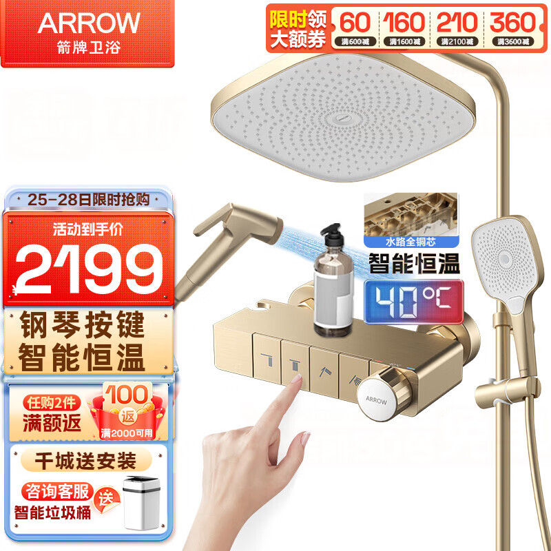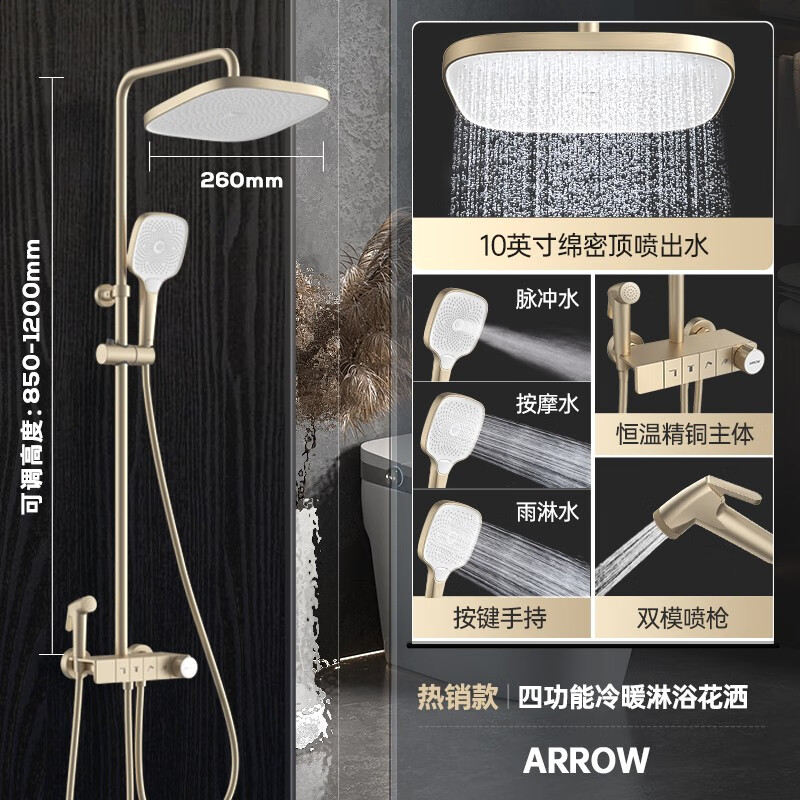 箭牌(ARROW) 淋浴花洒套装增压花洒全套莲蓬头淋雨器套装浴室花洒按键花洒 【拉丝金】按键丨恒温款价格:2809.00元!