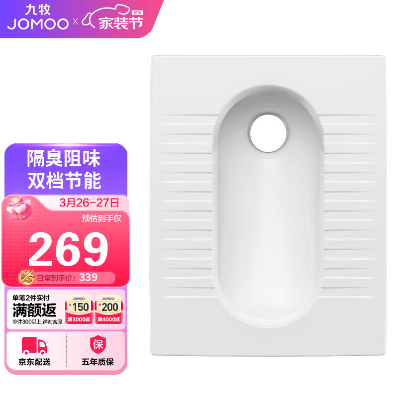 九牧(JOMOO)蹲便器家用蹲坑防臭易清洁陶瓷后排水不带存水弯14136-1/11P-1价格:309.00元!