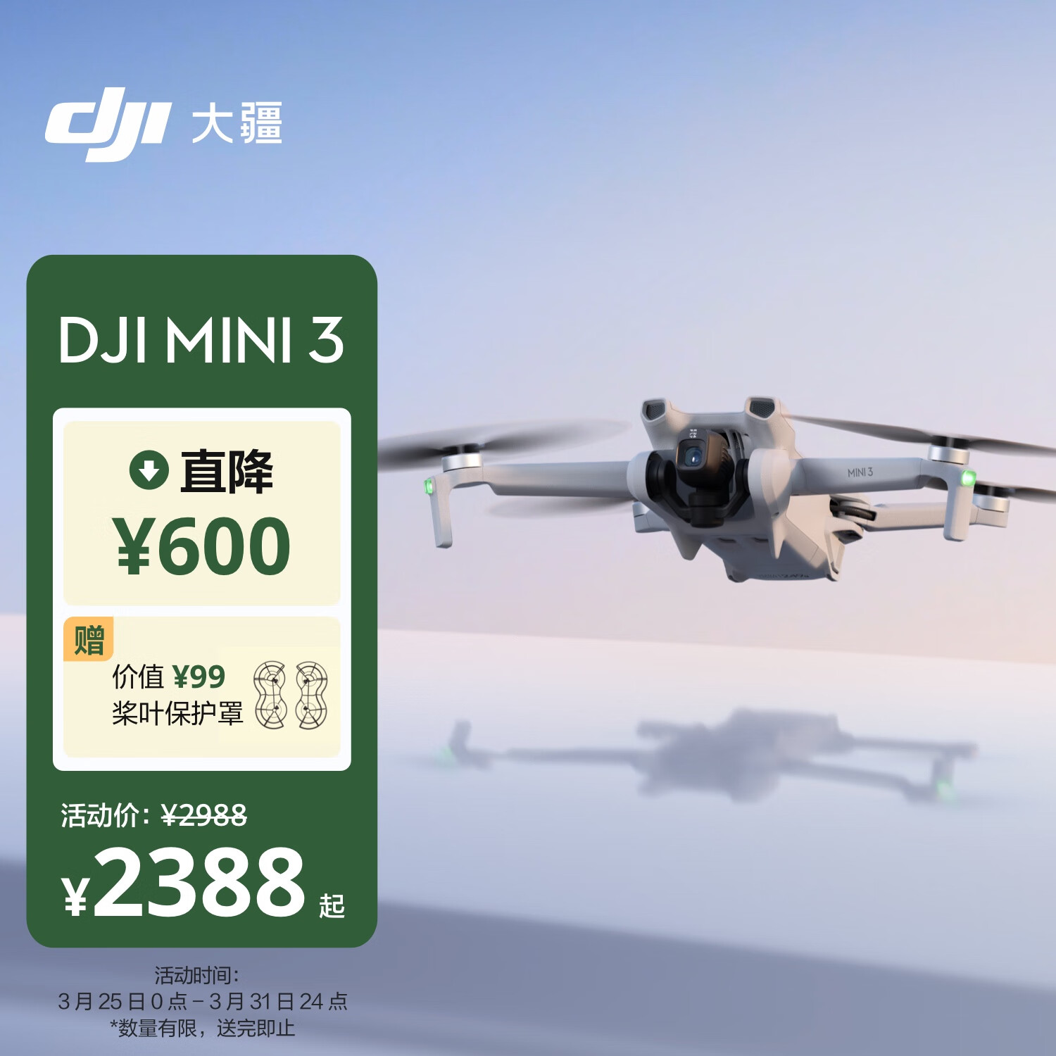 大疆 DJI Mini 3 优选迷你航拍机 智能高清拍摄无人机 小型遥控飞机+随心换 2 年版实体卡+128G内存卡价格:3020.90元!