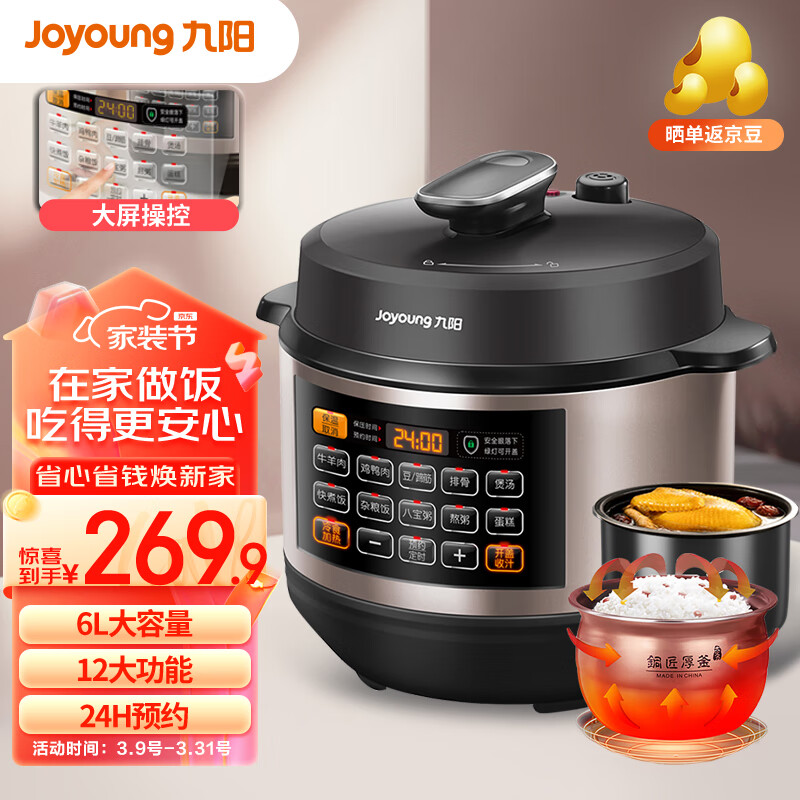 九阳(Joyoung)智能家用6L大容量电锅煲电高压锅一锅双胆大屏一键操作锅煮饭煲6升Y-60C817价格:269.90元!