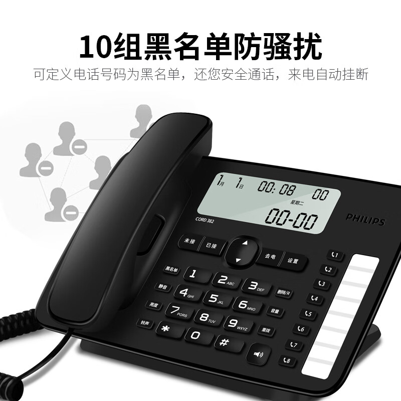 飞利浦(PHILIPS)电话机座机 固定电话 办公家用 免提通话 免电池 来电显示 8组一键拨号 黑名单 CORD382 黑色价格:188.00元!