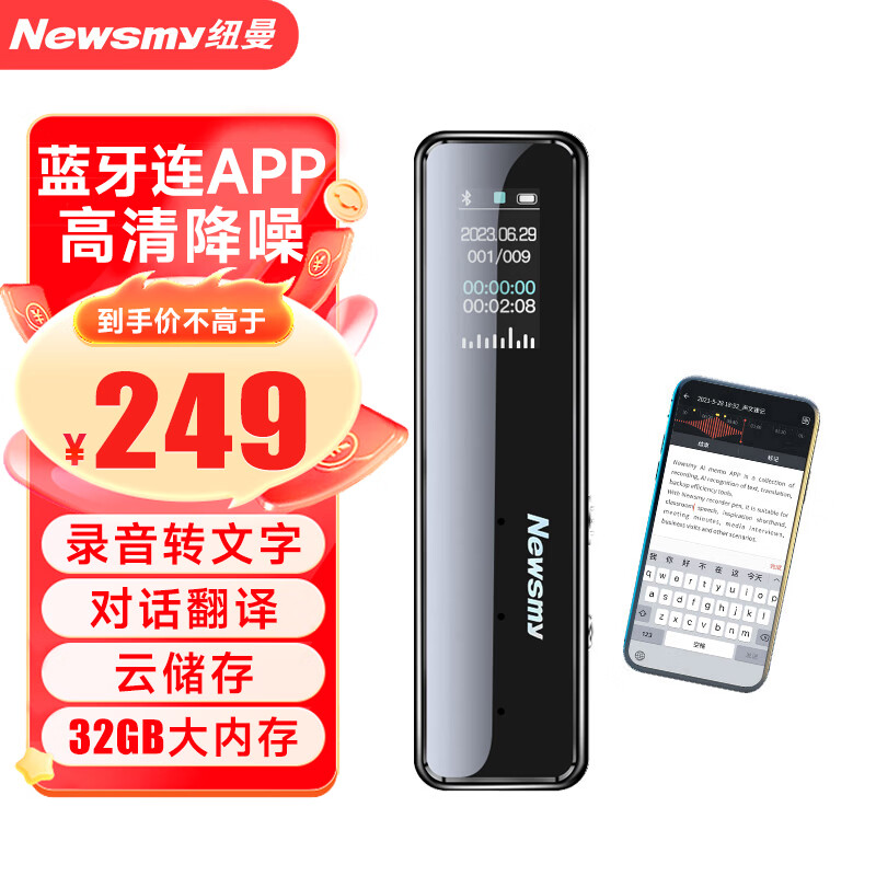 纽曼智能录音笔 XD01 声文速记 32G+云存储 专业高清降噪 会议录音转文字 实时成稿 同传翻译 黑色价格:299.00元!