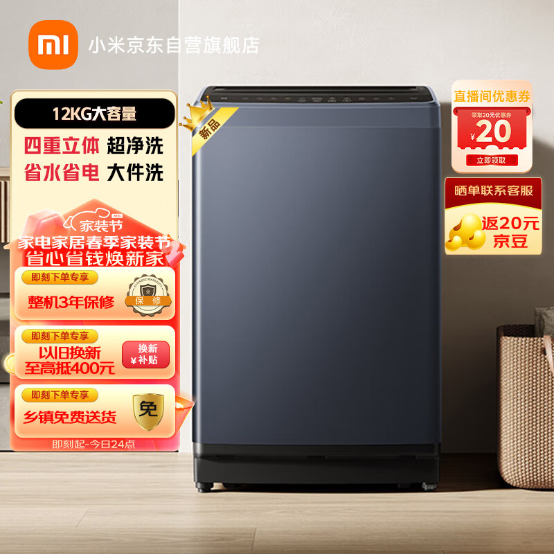 米家小米波轮全自动洗衣机租房宿舍 12KG超大容量四重立体超净洗24小时预约省水省电 XQB120MJ301价格:998.00元!