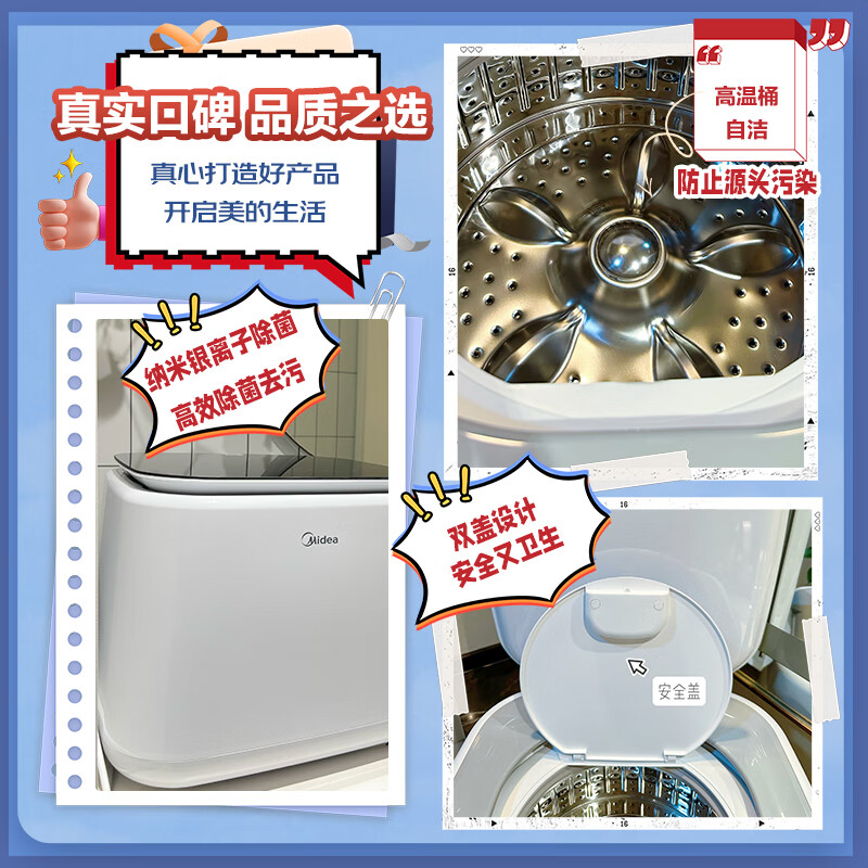 1、美的的洗衣机很不错,第二天就到货了,到货当天安装的。安装很快。买给宝宝洗衣服用的,用了几次才来评价。高温煮洗的功能很不错。洗出来还是热的,自清洁也不错。满意。