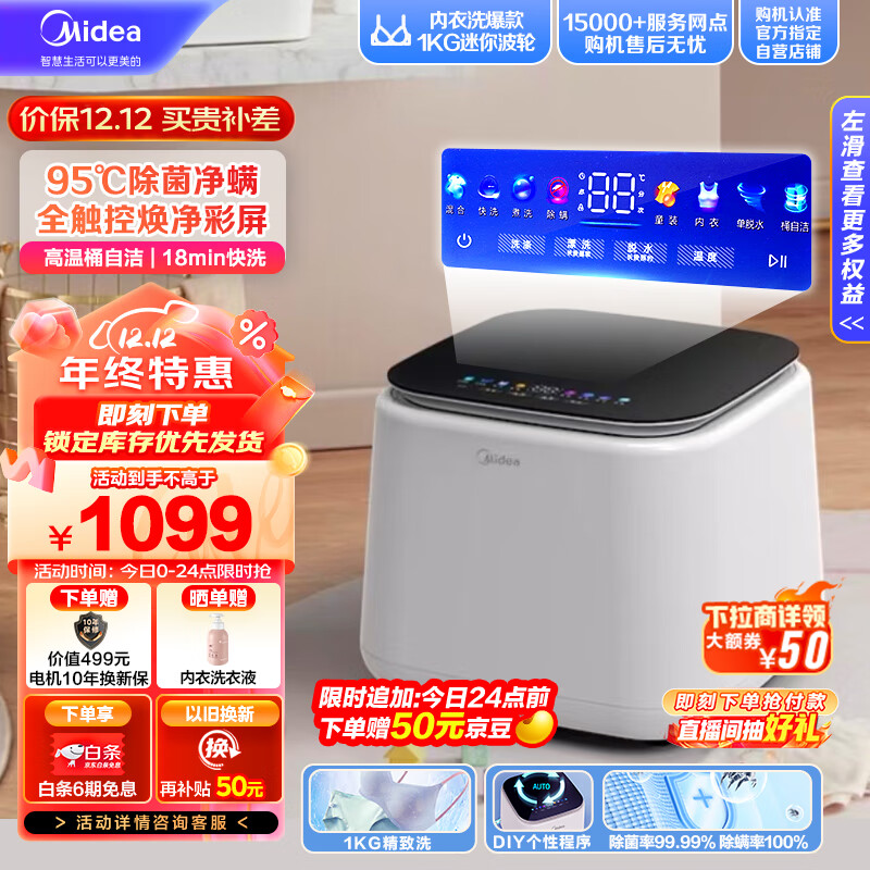 美的(Midea)1KG迷你洗衣机全自动 美的焕净内衣洗衣机小型 迷你洗衣机 婴儿洗衣机 95℃除菌净螨 MNB10-01W价格:1099.00元!