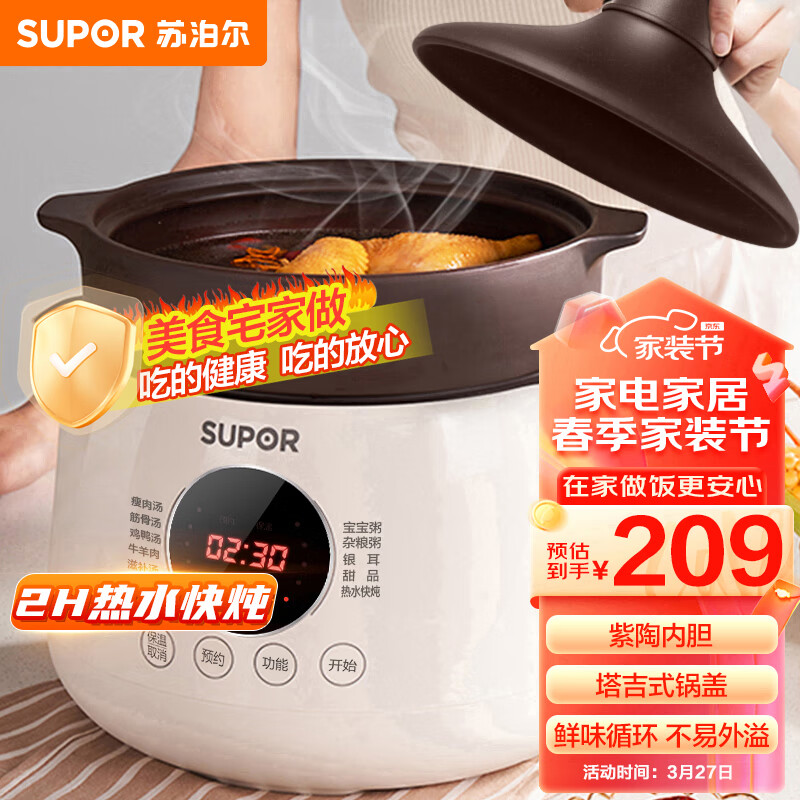 苏泊尔(SUPOR)电炖锅 电炖盅 电砂锅煲汤锅 炖汤锅 燕窝炖锅 紫砂锅 电汤锅 煮粥神器 电煮锅 家用 5L DG50YC851价格:209.00元!