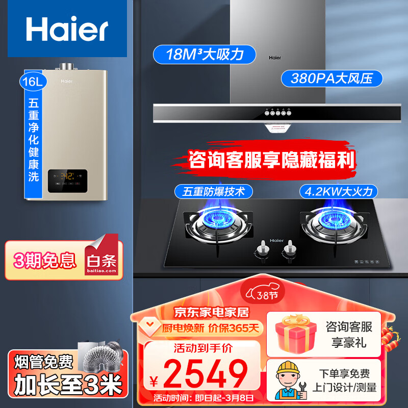海尔(Haier)抽油烟机燃气灶套装18m3一级能效欧式顶吸E900T6V+4.2KW灶Q235+16升热水器16K3BD厨房三件套[家电]价格:3049.00元!