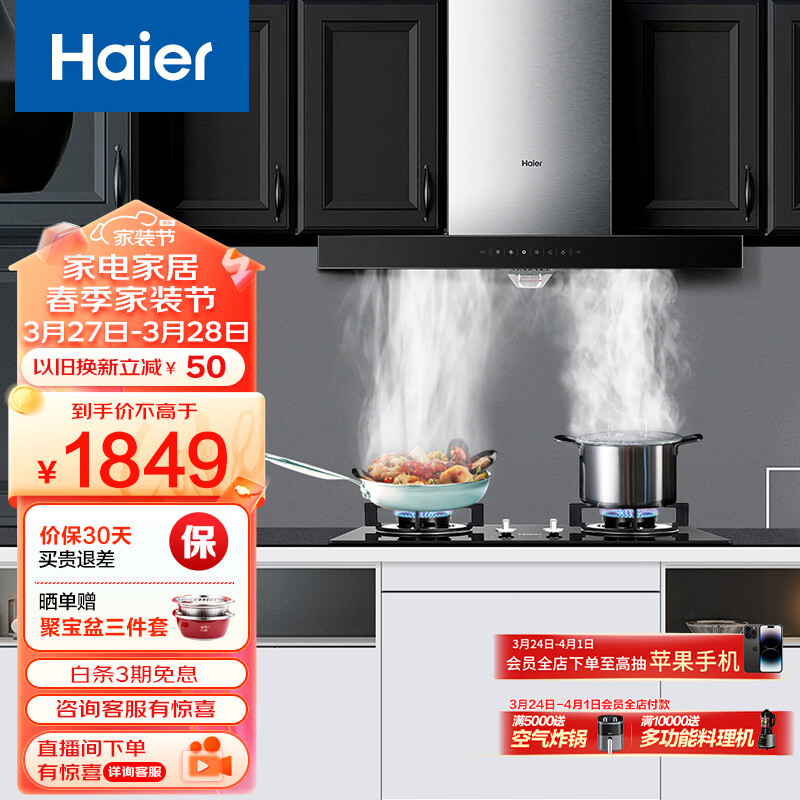 海尔(Haier)抽油烟机 烟灶套装 21m3/min大吸力 挥手智控自旋洗 欧式家用吸油烟机燃气灶 T11+Q2BE2(天)价格:1849.00元!