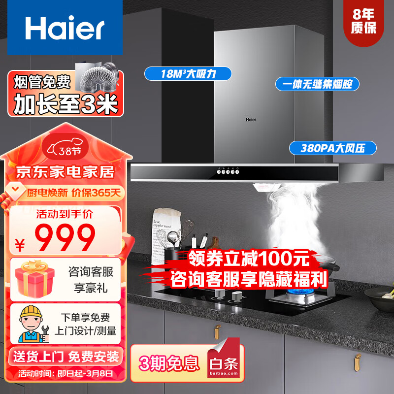 海尔(Haier)油烟机 欧式顶吸抽油烟机家用18立方大吸力 一级能效三档调速 吸脱排油烟机CXW-200-E900T6V[家电]价格:1099.00元!