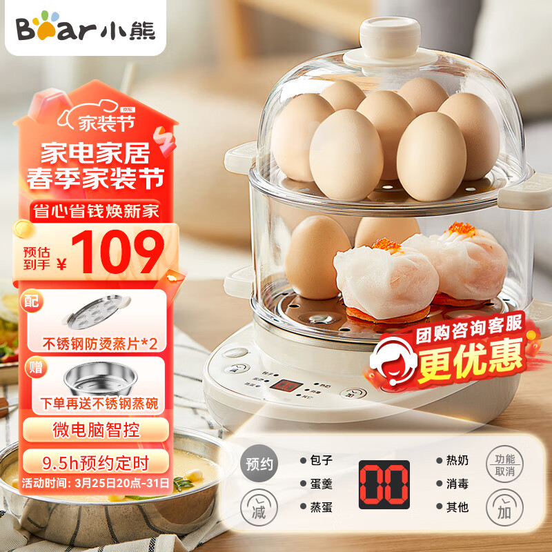 小熊(Bear)煮蛋器 双层家用多功能蒸蛋器 不锈钢早餐蒸点心蒸锅 可预约定时自动断电蒸锅 ZDQ-C14Q8价格:108.00元!