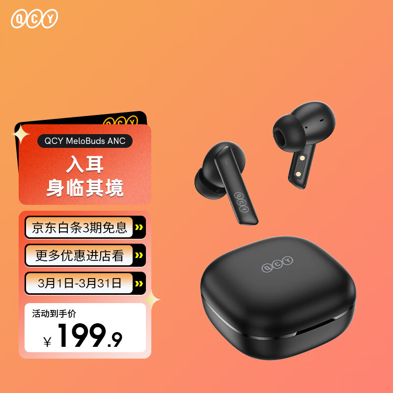 QCY MeloBuds ANC真无线蓝牙耳机主动降噪入耳游戏低延迟通话降噪运动降噪小方糖适用全部手机 黑色价格:199.90元!
