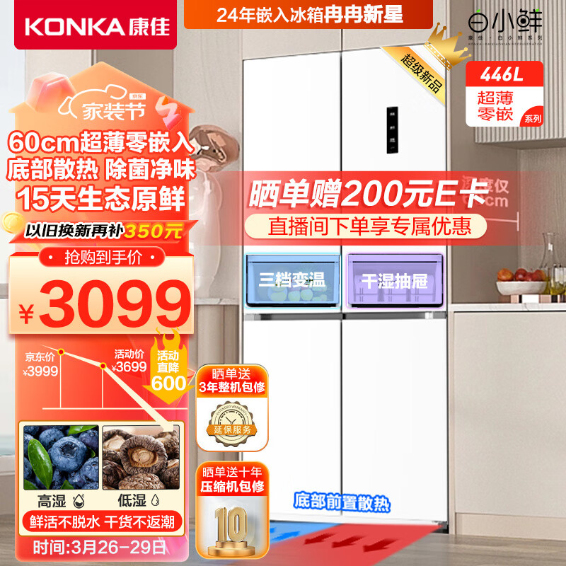 康佳446升60厘米零嵌超薄嵌入式底部散热一级能效双变频无霜十字对开四开门冰箱BCD-446WEGB4SP白小鲜价格:3299.00元!
