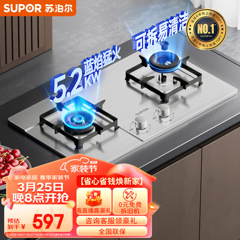 苏泊尔(SUPOR)燃气灶双灶家用 天然气双灶具5.2kW大火力猛火 易洁耐用不锈钢面板 台嵌两用灶具 DS35天价格:597.00元!