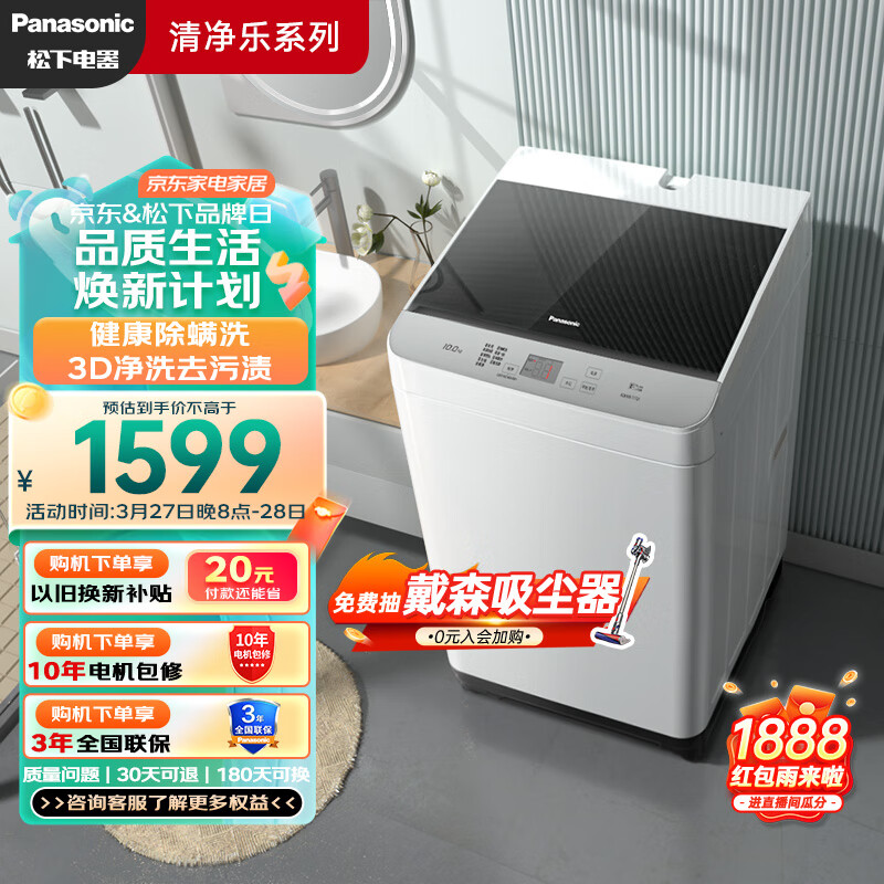 松下(Panasonic)全自动波轮洗衣机10公斤 节能省水除螨洗 大容量智能洗涤桶洗净快速洗XQB100-T1721价格:1599.00元!